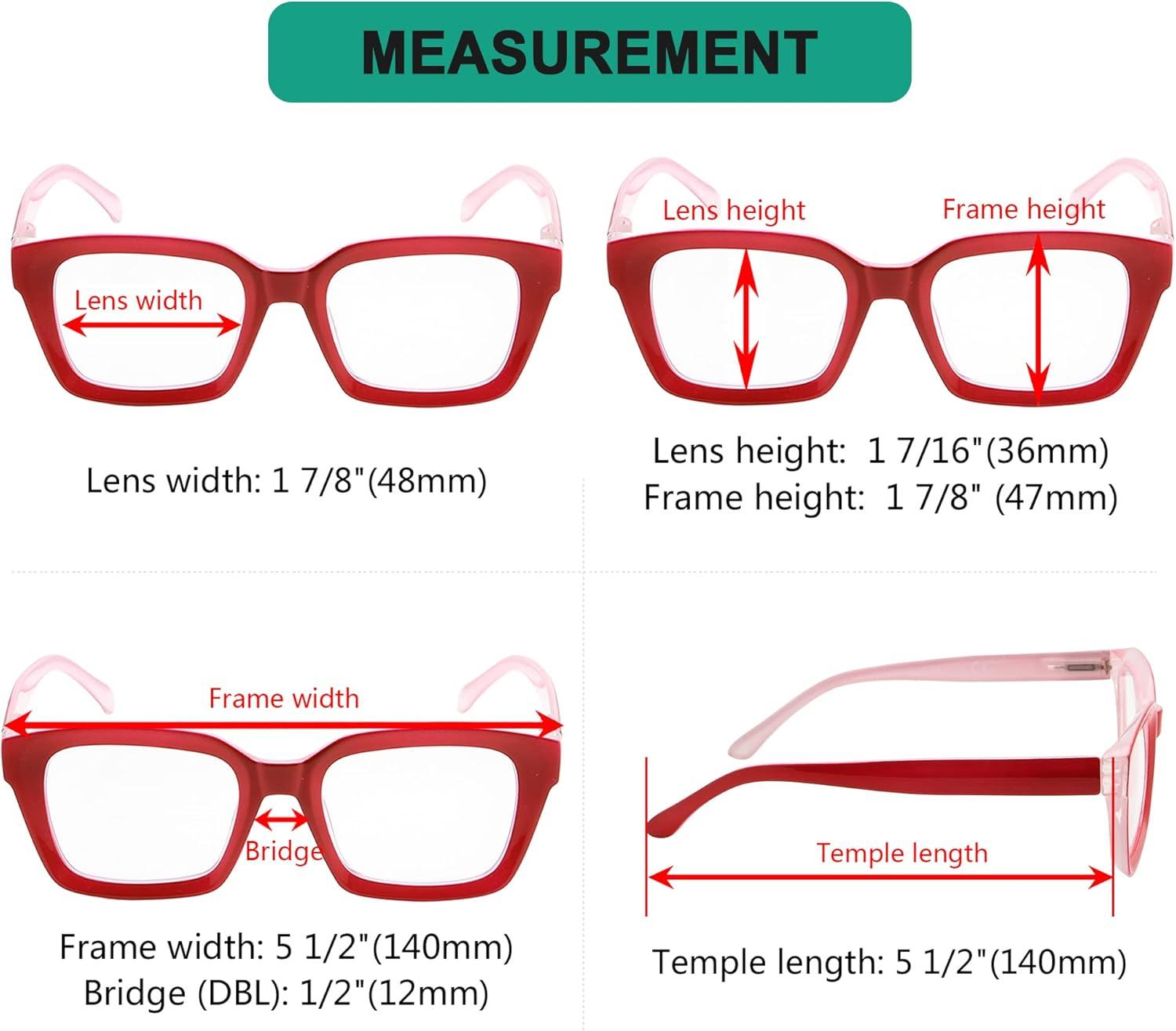 READING GLASSES DIMENSION – Frame material is Plastic, Lens width about 1 7/8 inches (48mm), Frame width about 5 1/2 inches (140mm), Lens height about 1 7/16 inches (36mm), Frame height about 1 7/8 inches (47mm), Bridge (DBL) about 1/2 inches (12mm), Temple length about 5 1/2 inches (140mm), with spring hinge