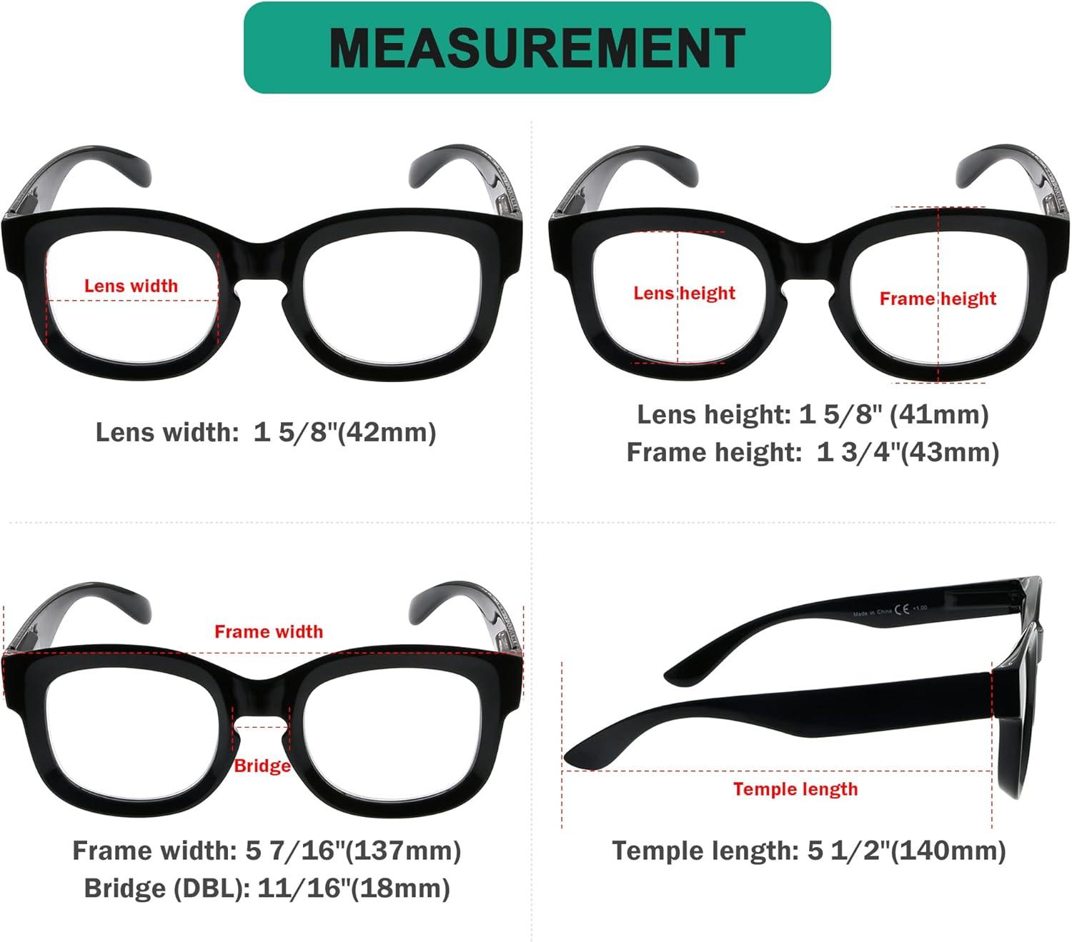 PRODUCTS DIMENSION – Frame Material is Plastic, Lens width about 1 5/8 inches(42mm), Frame width about 5 7/16 inches(138mm), Lens height about 1 5/8 inches(42mm), Frame height about 1 3/4 inches(44mm), Bridge(DBL) about 11/16 inches(18mm), Temple length about 5 1/2 inches(140mm), with spring hinge