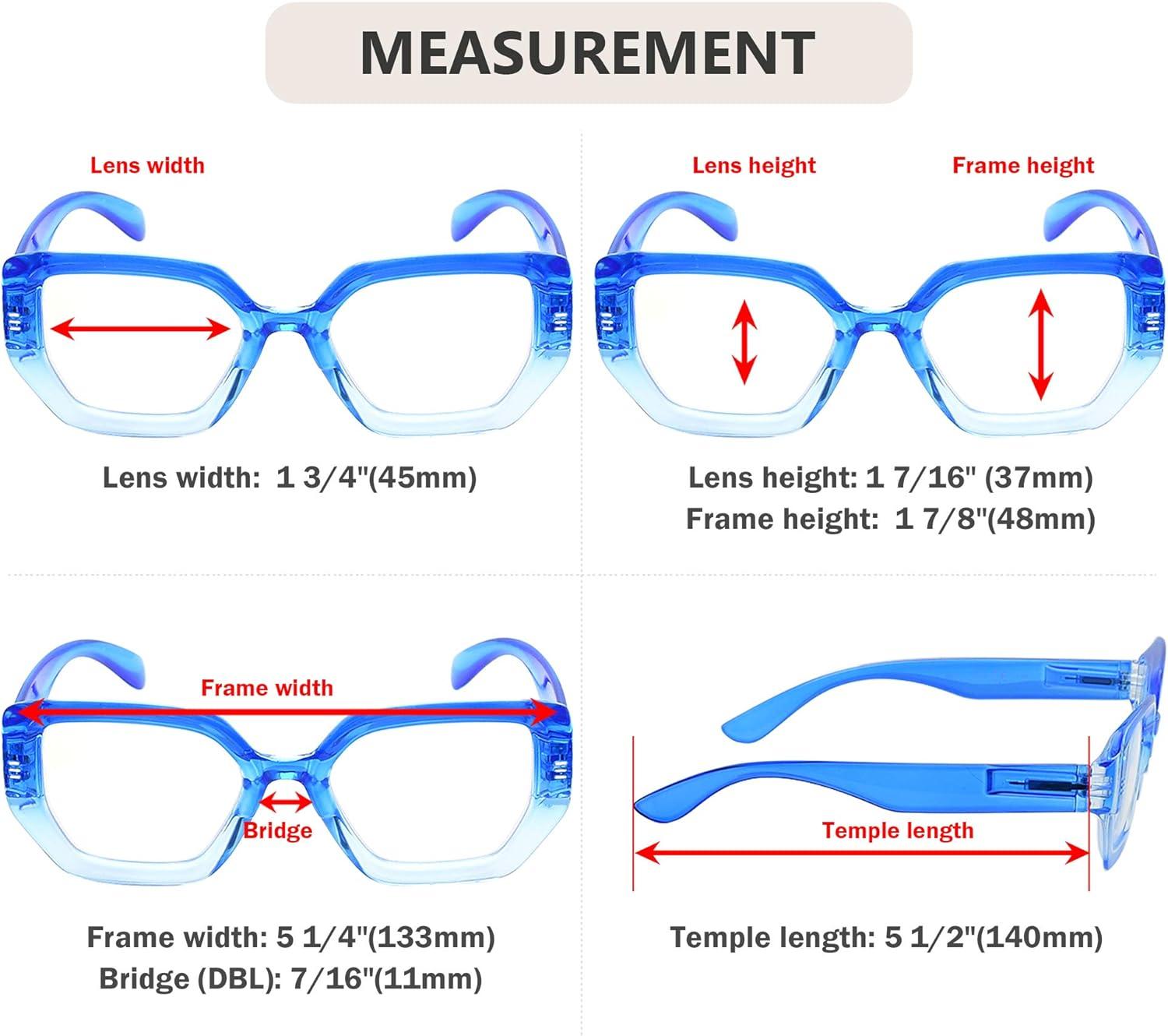 Products Dimension- Frame Material is Plastic,Lens width about 1 3/4 inches(45mm),Frame width about 5 1/4 inches(133mm),Lens height about 1 7/16 inches(37mm),Frame height about 1 7/8 inches(48mm), Bridge(DBL) about 7/16 inches(11mm), Temple length about 5 1/2 inches(140mm),with spring hinge